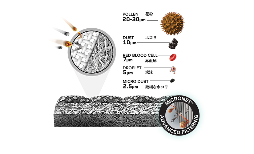 NAROO MASK Fシリーズで使用している、新技術の目の細かいマイクロネットフィルターは、花粉や大気中のホコリを除去します。